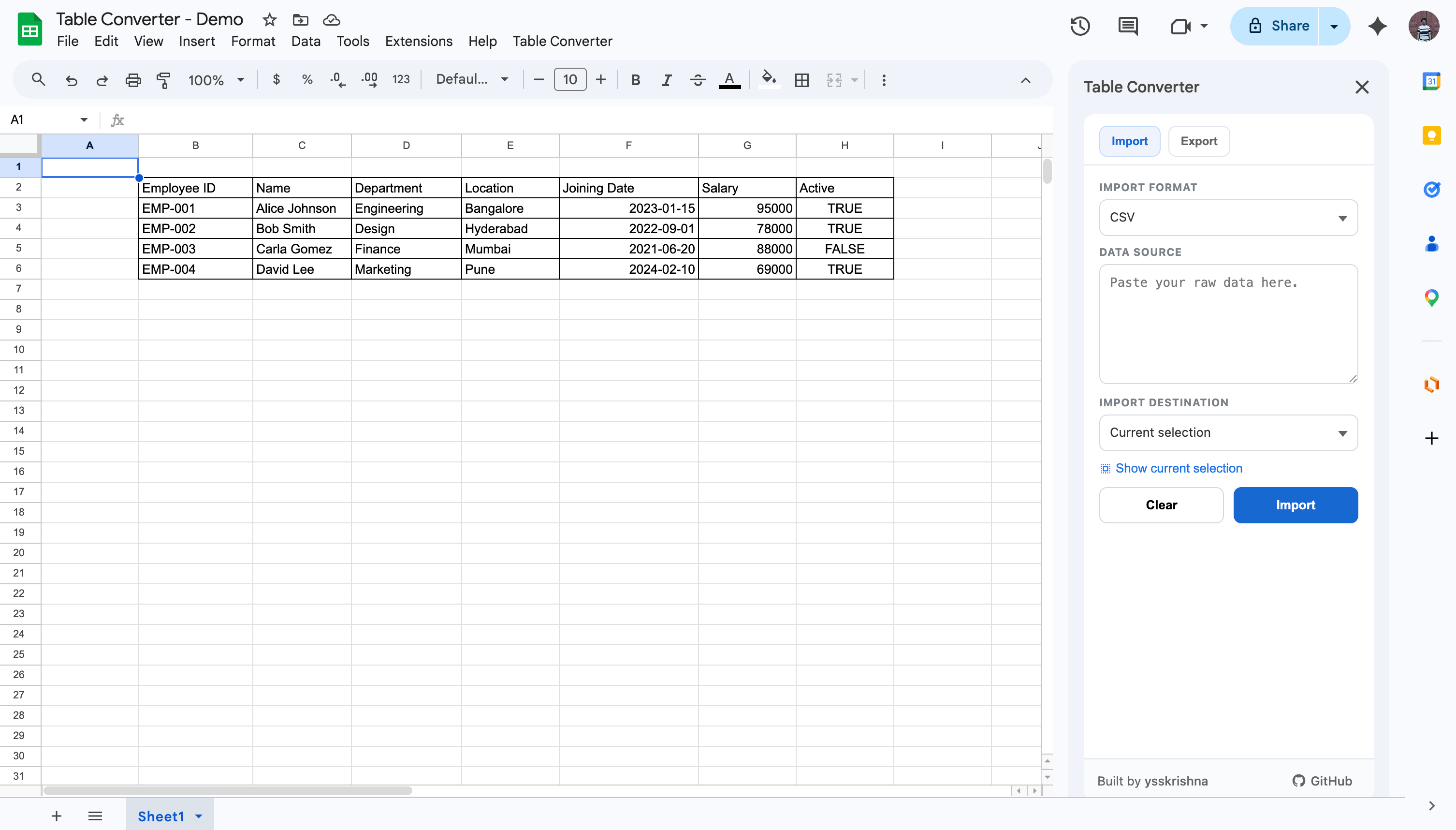 Open the Table Converter sidebar, paste the raw JSON, Markdown, HTML, or CSV, and run Import. You can place the result at the active cell or on a new sheet so you do not overwrite a layout you already trust.